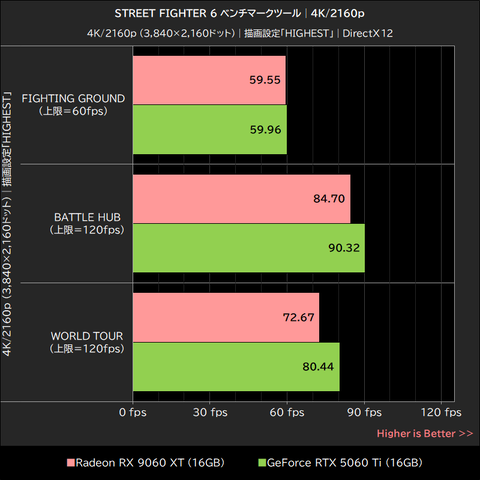 WQHD/1440p以下の解像度において、Radeon RX 9060 XTとGeForce RTX 5060 Tiは上限値に近い平均フレームレートを記録しており、ほぼ同等のパフォーマンスを発揮している。一方で、4K/2160pでは上限120fpsのBATTLE HUBで約6%、WORLD TOURでは約10%、Radeon RX 9060 XTがGeForce RTX 5060 Tiを下回った。