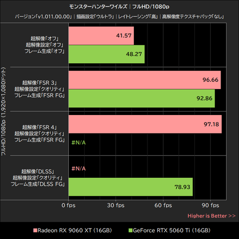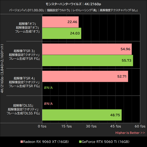 超解像「オフ」でのRadeon RX 9060 XTとGeForce RTX 5060 Tiの平均フレームレートは1~2fpsの僅差で、超解像とフレーム生成をFSR 3で実行した場合はRadeon RX 9060 XTがGeForce RTX 5060 Tiを4~7%上回った。