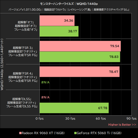 Radeon RX 9060 XTは、超解像「オフ」でGeForce RTX 5060 Tiを7~14%下回っているが、超解像およびフレーム生成を「FSR 3」で行なった場合、WQHD/1440p以下の解像度ではGeForce RTX 5060 Tiを1~4%上回った。