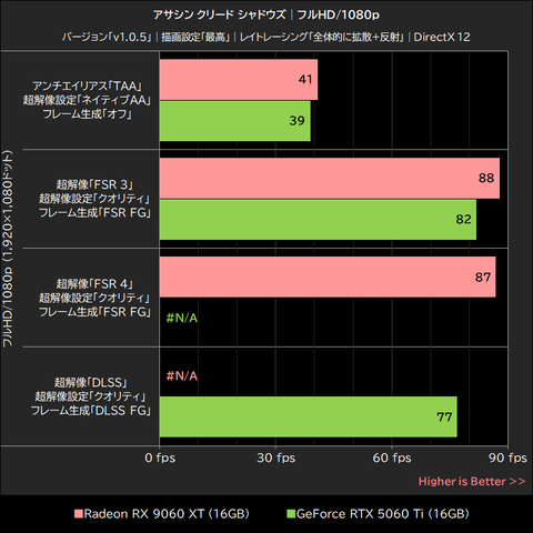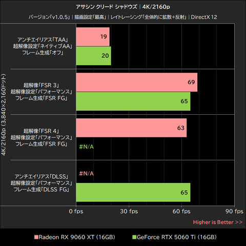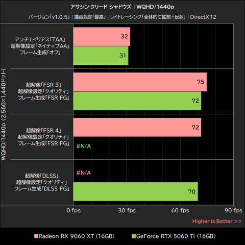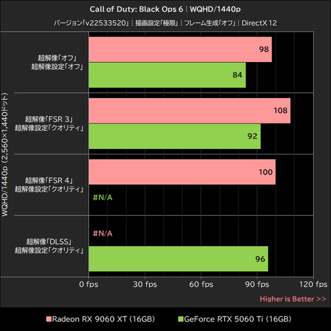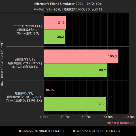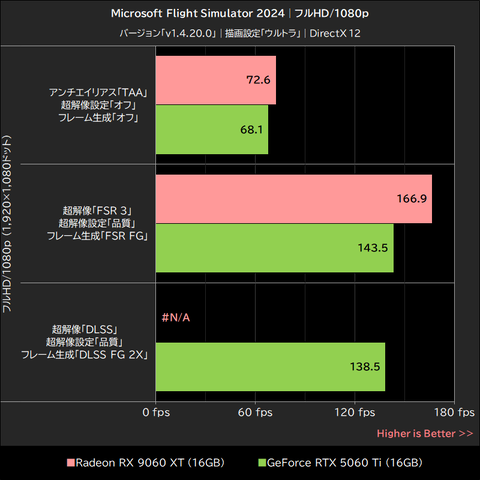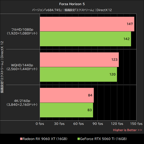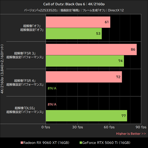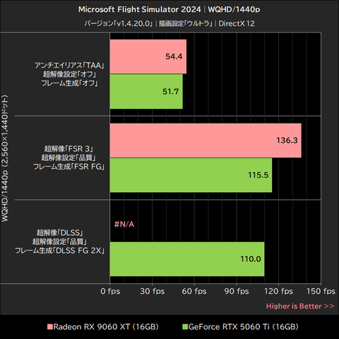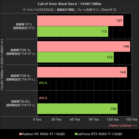 このゲームではRadeon RX 9060 XTが明確にGeForce RTX 5060 Tiを上回るパフォーマンスを発揮。超解像「オフ」で15~21%、超解像「FSR 3」でも16~21%、いずれもGeForce RTX 5060 Tiを上回った。