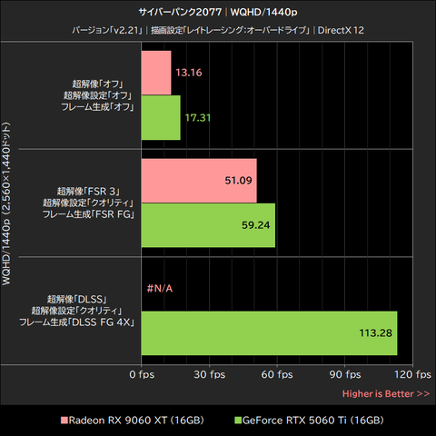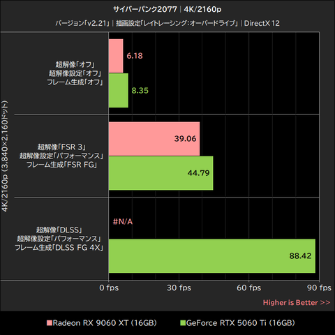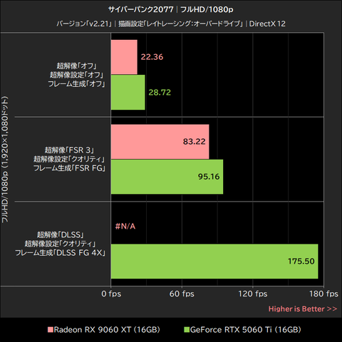 また、GeForce RTX 5060 TiはDLSS 4のマルチフレーム生成によって平均フレームレートを大幅に引き上げることも可能であり、サイバーパンク2077に関してはGeForce RTX 5060 Tiの優位が明らかな結果となった。