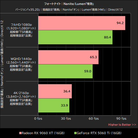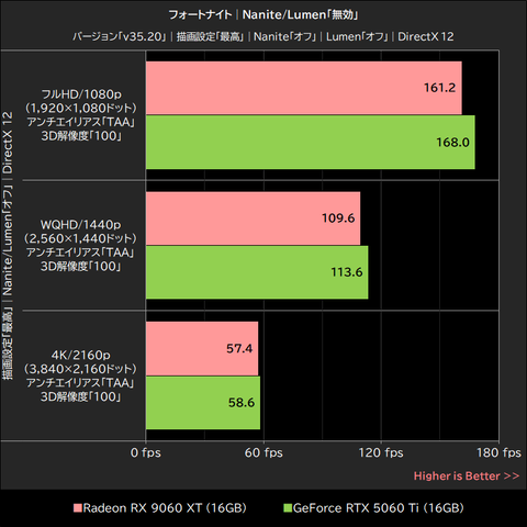Nanite/Lumen無効時のRadeon RX 9060 XTは、フルHD/1080pとWQHD/1440pで約4%、4K/2160pでは約2%、GeForce RTX 5060 Tiを僅差ながら下回った。