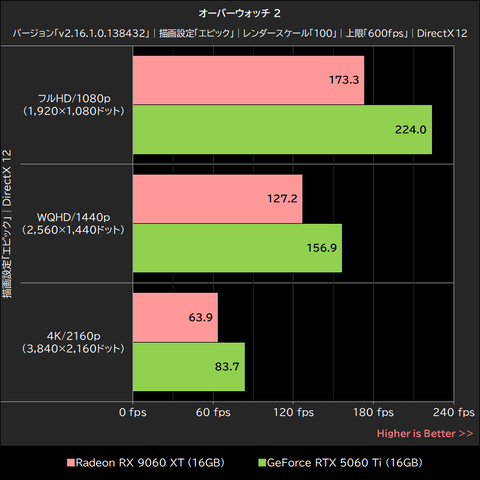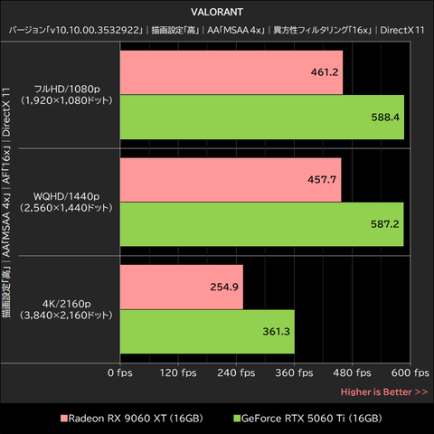 一方、4K/2160pに関してはGPUボトルネックによるフレームレートの低下が生じており、平均254.9fpsを記録したRadeon RX 9060 XTが、平均361.3fpsのGeForce RTX 5060 Tiを約29%下回った。