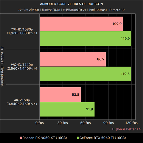 ARMORED CORE VI FIRES OF RUBICONでは、グラフィックプリセットを「最高」に設定し、フルHD/1080p~4K/2160pまでの画面解像度で平均フレームレートを計測した。テスト時の上限フレームレートは120fps。