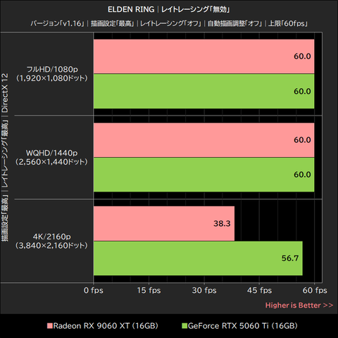 レイトレーシング「オフ」では、Radeon RX 9060 XTとGeForce RTX 5060 TiがWQHD/1440p以下の解像度で上限フレームレートに達しており、GPUボトルネックによるフレームレートの低下が生じた4K/2160pでは、平均38.3fpsを記録したRadeon RX 9060 XTが、平均56.7fpsのGeForce RTX 5060 Tiを約33%下回った。