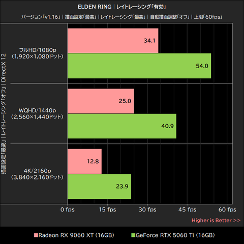 レイトレーシングを「最高」に設定した場合、Radeon RX 9060 XTが記録した平均フレームレートは、GeForce RTX 5060 TiをフルHD/1080pで約37%、WQHD/1440pで約39%、4K/2160pで約47%と大きく下回った。