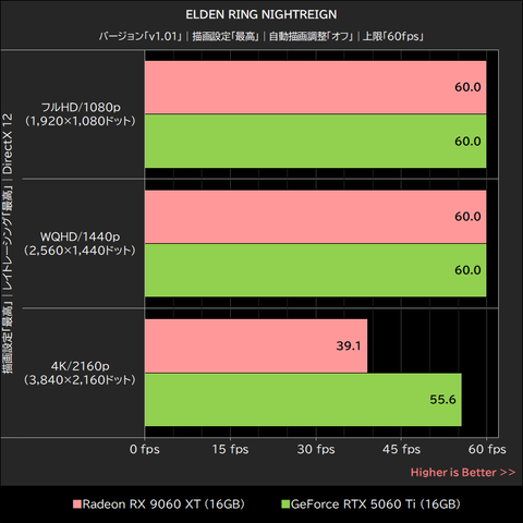 ELDEN RING NIGHTREIGNでは、グラフィックプリセットを「最高」に設定し、フルHD/1080p~4K/2160pまでの画面解像度で平均フレームレートを計測した。テスト時の上限フレームレートは60fps。