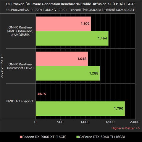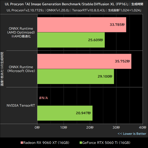 Radeon RX 9060 XTは、AMD最適化版のONNX Runtime利用時に約24%、Microsoft Olive最適化版のONNX Runtime利用時に約19%、いずれもGeForce RTX 5060 Tiを下回った。また、両GPUのベストスコアを比較した場合、Radeon RX 9060 XTはTensorRT利用時のGeForce RTX 5060 Tiを約38%も下回っている。