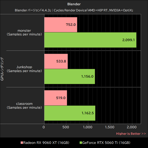 念のため、Blender v4.4.3を使用して公式ベンチマーク相当のテストを実行してみたが、ここでもRadeon RX 9060 XTはGeForce RTX 5060 Tiをmonsterで約64%、junkshopで約54%、classroomで約55%も下回っている。