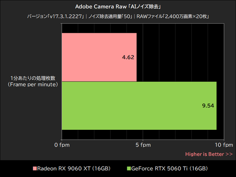 レタッチではRadeon RX 9060 XTがGeForce RTX 5060 Tiを約1%上回っているものの、バッチ処理においてGeForce RTX 5060 Tiを約9%下回ったことが総合スコアに響いたようだ。