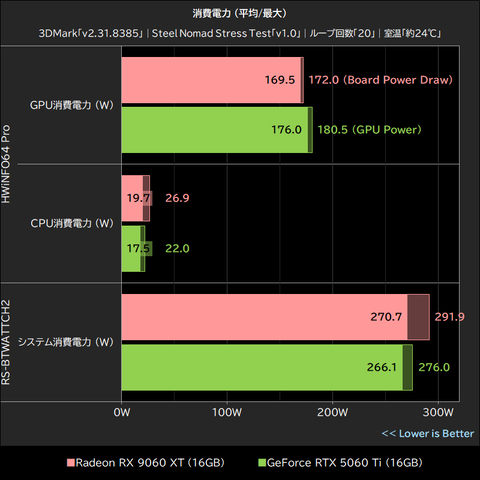 一方、ベンチマークテスト実行中にRadeon RX 9060 XTが記録した平均消費電力は216.2~279.3Wで、198.1~267.3WだったGeForce RTX 5060 Tiより2.0~32.3W高い平均消費電力となっている。