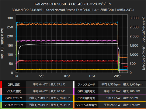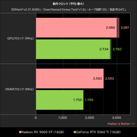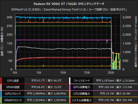 負荷テスト中のRadeon RX 9060 XTは、平均169.5W(最大172.0W)の電力を消費しながら動作しており、この時のGPU温度は平均63.7℃(最大66.0℃)、VRAM温度は平均68.4℃(最大72.0℃)で、GPUクロックは平均2,980MHz(最大3,081MHz)、VRAMクロックは平均2,502MHz(最大2,502MHz)で動作していた。