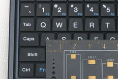 なお、キーピッチは公称値で約12mm、実測で11.5mm強と、絶対的な数値で狭いため、長時間のタッチタイピングは厳しく、机に置いて5本指でタッチタイピングすることはできない。しかし、両手で本体を左右から掴んで親指で入力する「親指打ち」や、卓上に置いた際の「人差し指1本打法」は意外にも馴染みやすい。移動中の電車内など、限られたスペースでの操作性を高めた設計と言える。