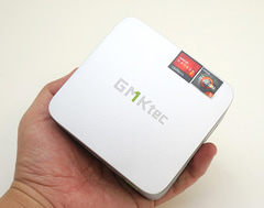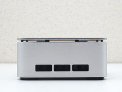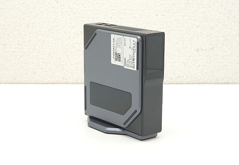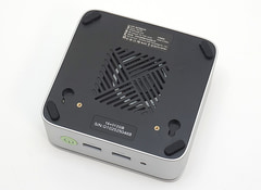 筐体の素材はシルバーのプラスチックで、天板にはGMKtekのロゴが印刷されている。前面に装備する緑色の電源ボタンとともに、GMKtekのミニPCではおなじみの意匠である。底面にCPUを冷却するためのファンと吸気口を備える。右側面に排気口を装備しており、利用中はそれなりに暖かい風が吹き出してくるため、運用時は右側面を塞がないようにしたい。
