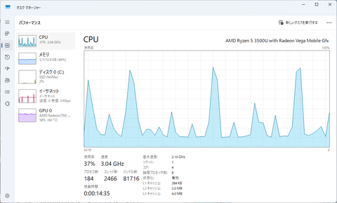 GPUコアのアーキテクチャは「Vega」であり、これも最新世代のCPUが搭載するGPUコアと比べるとかなり世代が古い。こうしたことを踏まえると、基本性能にはあまり期待できそうにない。とはいえ、Ryzen 5 3500U自体はMicrosoftがWindows 11サポートを保障するCPUであり、3万円を切るという実売価格のインパクトは大きい。