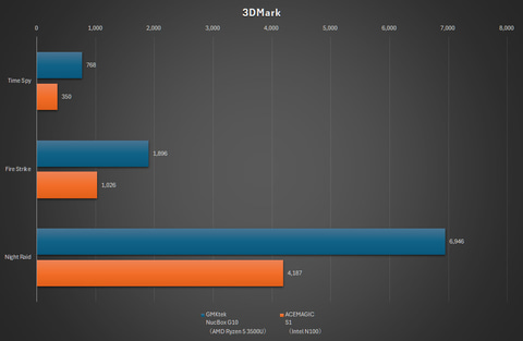 下のグラフでは、ゲーミング性能の指標として分かりやすい3DMarkの各種テストのScoreをまとめている。N100を搭載するS1と比べるとNucBox G10の方が優れており、同じ価格帯でも違いがあることは分かる。ただ先ほども述べた通り、このレベルの性能では焼け石に水であり、N100と同様に重い作業には向いていないことが分かる。