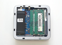 天板のプレートを本体に固定している前面上部の爪を上にちょっと引っ張るとその爪が外れ、カパッと全体が外れる構造になっている。天板を外すとメモリスロットとM.2スロットにアクセスでき、内部にはDDR4 SO-DIMMモジュールが2枚と、システム用のM.2 SSDが装着済みだった。