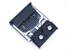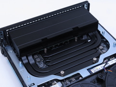 開けてまず目に付くのがヒートパイプを6本採用した大型のヒートシンクと2基のファンだ。ちなみにCPUとヒートシンクの間の熱伝導には、一般的なグリスよりも高い性能を実現する相変化材料が使われている。こうした工夫により、最大ピークパワーは160Wに達するという。