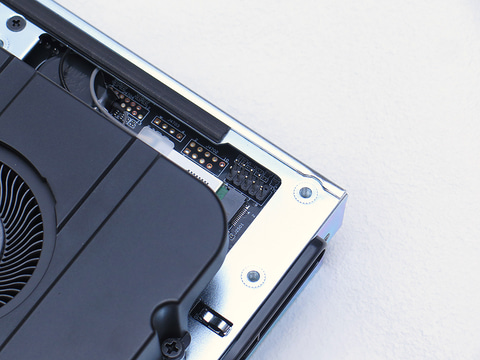 また、裏側にPCIe 4.0 x4(x16形状)の拡張スロットを備えている点も本製品ならでは。LowProfileでハーフレングス、なおかつシングルスロットというあたりで、中に収まるカードでは本機の特徴を生かせるものが少ないが、OCuLinkカードを使って外に出すという手段も残されている。