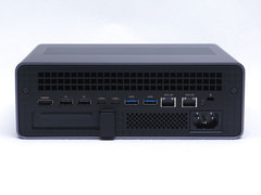 前面インターフェイスはUSB4 2基、USB 3.2 Gen 2、そして音声入出力と電源ボタン。背面にはUSB4 2.0 2基、USB 3.2 Gen 2 2基、USB 2.0 2基、10Gigabit Ethernet(10GbE) 2基(10GBASE-T)、HDMI出力を備えている。ミニPCとしては十分すぎるほどだ。