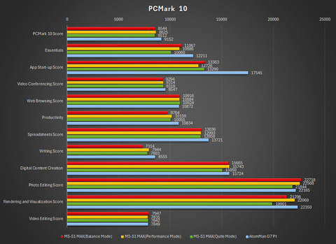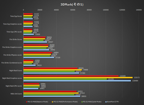 なお先述の通り、4つのモードが選べるのだが、今回はBalance Mode、Perfomance Mode、Quite Modeの3つでテストした。比較用に、ディスクリートGPUとしてRadeon RX 7600M XTを搭載した「AtomMan G7 Pt」の結果(静音モード)を並べてある。