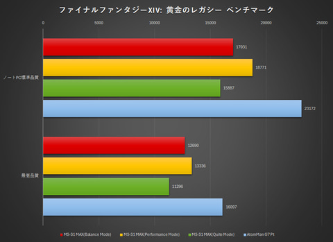 ファイナルファンタジーXIV: 黄金のレガシー ベンチマークでは、1,920×1,080ドットの最高品質設定では、いずれの性能モードでもスコアが1万に達し、「とても快適」の評価を獲得。Ryzen AI 9 HX 370などではノートPC(標準品質)にしても1万に届かず、同じ最高品質にすると半分以下の4,000台なので、2倍以上の性能を持つ計算になる。