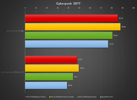 ファイナルファンタジーXIVではRadeon RX 7600M XTに敵わなかったのだが、Cyberpunk 2077(フルHD解像度)では逆にAtomMan G7 Ptを上回った。Radeon 8060SのアーキテクチャであるRDNA 3.5は、Radeon RX 7600M XTのRDNA 3から改善されたものなので、このあたりが効いた可能性が大きいと言えるだろう。