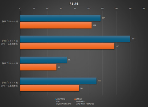 3Dグラフィックスの描画性能を計測できる「3DMark」でも、F5Aのほうが平均して10~13%ほど性能が高い。実際のPCゲームでの性能差については、描画負荷的にはミドルクラスの「ファイナルファンタジーXIV: 黄金のレガシー ベンチマーク」のScoreと、比較的軽めな「F1 24」の平均FPSで比較してみると、やはり10%前後の性能差がある。Ryzen 8000シリーズとの比較では、確かに性能が向上していることがよく分かる。