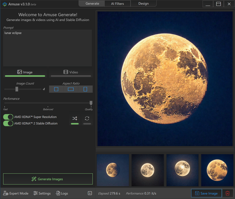 Amuse 3.1の利用方法は簡単で、Adrenalineの最新バージョンとAmuse 3.1をインストールする。Amuse 3.1を起動して「EZ Mode」にした場合、「Generate」タブから「Performance」を「quality」に変更すると、NPUを認識できる環境なら「AMD XDNA 2 Stable Diffusion」が有効になる。この状態になっていれば、画像生成にNPUが利用される。