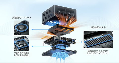 このCPUを搭載するミニPCは本誌でもすでに何度か取り上げているのでこれ以上細かくは紹介しないが、Ryzen 8000シリーズを搭載するミニPCと比べるとワンランク上の性能を発揮できることは間違いない。そしてこうした高性能なCPUのパワーを100%引き出すべく、銅製のヒートパイプとヒートシンク、大型のファンを組み合わせた冷却性能の高いCPUクーラーを搭載する。