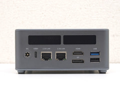 前面にはUSB 3.2 Gen 2を2基、USB4を1基装備する。背面には2.5Gigabit Ethernet(GbE)の有線LANポートを2基、HDMIとDisplayPort、USB4、USB 3.2 Gen 2、USB 2.0をそれぞれ1基ずつ搭載しており、ミニPCとしては平均的な構成だ。USB4はどちらもDisplayPort Alt Modeや給電に対応するので、使い勝手はよい。