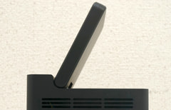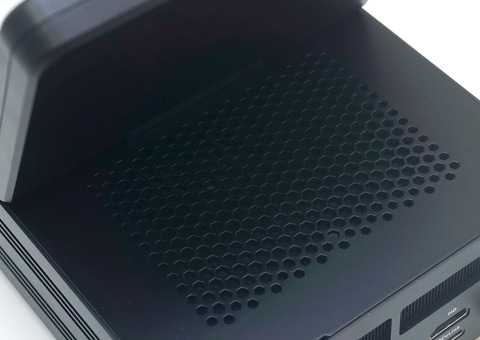 G-FLIP AI370は一般的なミニPCと違って、やや厚みのある筐体を採用しているが、これは5型の液晶モニターを天板に搭載しているからだ。手前にヒンジを装備しており、背面から手前に向かって液晶部分を起こすような感じでセッティングする。最大角度は60度でロック機構はなく、無段階で調整が可能だ。ただし角度が小さい状態だと、内蔵モニター部分が倒れてもとに戻る。