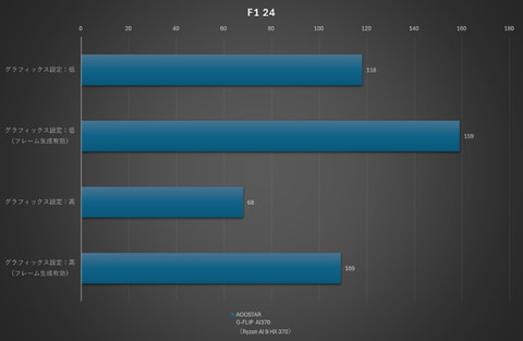 「F1 24」では[低]と[高]、「サイバーパンク2077」でも[低]と[高]に設定したときの平均fpsを比較している。またこれらのタイトルではフレーム生成機能に対応するので、フレーム生成機能を有効にしたときの平均fpsも計測した。