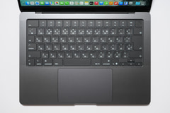 2023年にM3を搭載した14インチMacBook Proが登場して以降、同シリーズのデザインは基本的に踏襲されている。キーボードについても、MacBook Airや16インチMacBook Proとサイズや配列は共通。圧力を検知し、振動でクリック感を再現する「感圧タッチトラックパッド」も機能は同一で、パームレストのサイズに合わせて最大限の面積が確保されている。