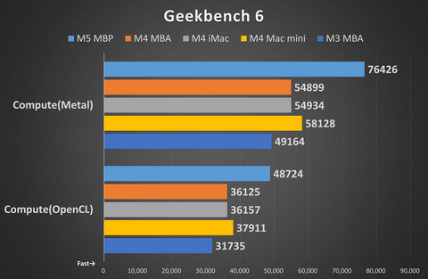 次に3Dグラフィックス性能を見ていこう。M5 MBPはM4 Mac miniに対して、「Geekbench 6」のCompute(Metal)で約131%相当、Compute(OpenCL)で約129%相当、さらに「GFXBench Metal」では9項目の平均で約121%相当のスコアを記録した。なお今回のテストでは、ディスプレイ解像度やスケーリングの影響を排除して、GPUの純粋な3D描画性能を比較するため、「GFXBench Metal」では「Offscreen」テストを採用している。