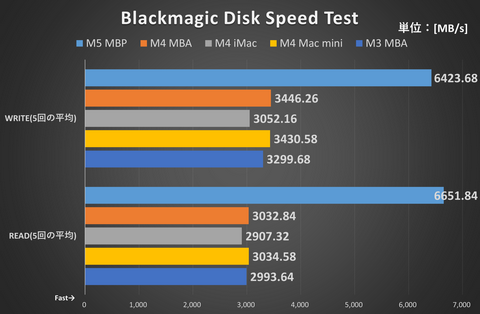 実は最も顕著なパフォーマンス向上を確認できたのがストレージ速度だ。M5 MBPはほかの4機種の平均に対して、「Blackmagic Disk Speed Test」のWRITEで194%相当、READで222%相当、「AmorphousDiskMark」のSEQ1M QD8シーケンシャルリードで211%相当、SEQ1M QD8シーケンシャルライトで208%相当という圧倒的な速度差を叩き出している。
