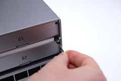 これはME Proが本体の最小化に執着していることを示すメッセージだと捉えられよう。ユーザーはまず、底面のシリコンパーツにはめ込まれた六角レンチを取り出し、それを利用してベイ左右のネジを回して内部にアクセスし、宝探しのようにACアダプタを取り出すことから始めることになる。