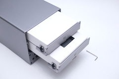 本体内の空きスペースをアクセサリ収納に活用するというこの発想は、一部PCケースでは見かけるが、NASとしては大胆だろう。しかもME Pro自体、ベイがツールレスでワンタッチで外せるわけではないため、なおさらだ。