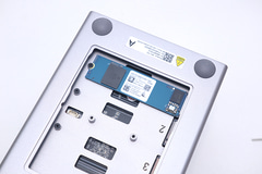 ちなみに、2基のHDDベイのほかに、底面にM.2 2280対応のSSDスロットが3基装備されている。このうち1基はPCIe 3.0 x2接続で、システムドライブのSSDが接続済み。残り2基はPCIe 3.0 x1接続となっている。いずれも底面のフタがヒートシンク兼用となっていて、サーマルパッドでSSDからの熱を奪う。こちらはパッシブ放熱を想定しているわけだ。
