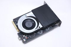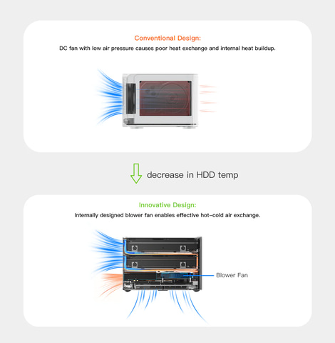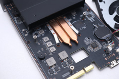 これを可能にしたのが、サーマルパッドを備え付けた金属製ドライブトレー、オールアルミニウムの筐体による自然放熱、そしてCPU冷却にも使われる1基のブロワーファンだ。このブロワーファンは、一般的なノートPCやミニPCと同様に本体前側に配置され、後部に搭載されるCPUヒートシンクに対して吹き付け、背面底部に排出する形となっている。しかし吸気は前面ではなく背面の上部から行なわれるため、吸気の過程で2基のHDDベイを通ってドライブの熱を奪う設計となっている。