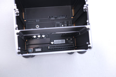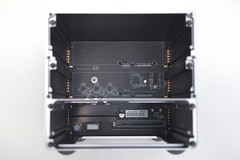最初はME ProがME Miniと同様に電源内蔵なのか、と思ったりもしたが、背面にはれっきとしたDC入力があるためそうではない。しかし、マグネットで着脱できる背面のフィルタを外してすぐ分かった。そう、ACアダプタ類は3.5インチベイに取り付けられた中箱に収まっていたのだ。