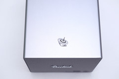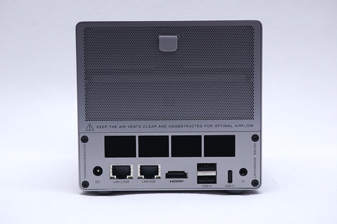 本体は3.5インチHDDよりわずかに一回り大きいだけのフットプリントで、ギュッと小さくまとめられ、一般的な2ベイNASの半分程度のサイズだとうたわれている。前面はHDD LEDやLCDなどなく、ホワイトLEDがさり気なく光る電源ボタンとUSB 3.2 Gen 1ポート、そしてリセットとCMOSリセットホールだけだ。知らない誰かに「これはNAS(PC)です」と言わなければ、金属筐体のスピーカーか、サブウーファだと間違えられることだろう。