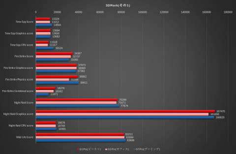 結果から分かる通り、いずれもG7 Proとほぼ拮抗するが、CPUのシングルスレッド性能はG7 Proのほうが有利、マルチスレッド性能はG1 PROのほうが有利、そしてGPU性能は概ねG7 Proがやや高い、という結果となった。