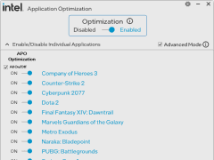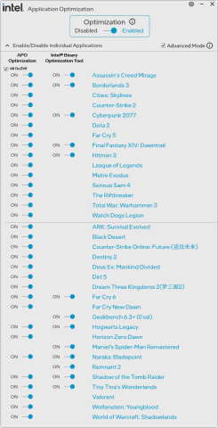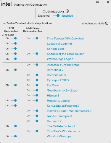 Core Ultra 200S Plusでは新機軸として「Intel Binary Optimization Tool」が導入された。これはバイナリ変換レイヤーを用いることで、ほかのCPU向けに最適化された一部のゲームでパフォーマンスを改善する技術で、APO(Application Optimization)のユーティリティに追加する形で実装されている。