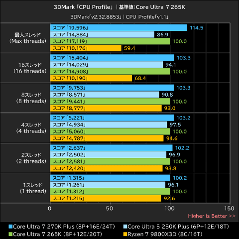 CPU性能をスレッド数ごとに計測する3DMarkのベンチマークテスト「CPU Profile」では、Core Ultra 7 265Kのスコアを基準に指数化したグラフを作成した。
