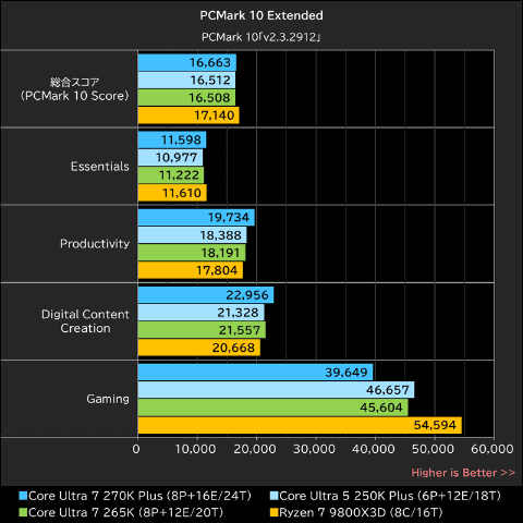 ただ、サブスコアを確認してみると、Core Ultra 7 270K PlusはGaming以外の項目ではRyzen 7 9800X3Dと同等かそれ以上のスコアを記録している。PCMark 10のGamingテストは、コア数の多いCPUと相性の悪い3DMarkのFire Strikeを利用しており、実際にCore Ultra 7 270K PlusのGamingスコアが不自然に低いことが見て取れる。一部テストとの相性の悪さが結果に影響している点を踏まえて参考にしてもらいたい。
