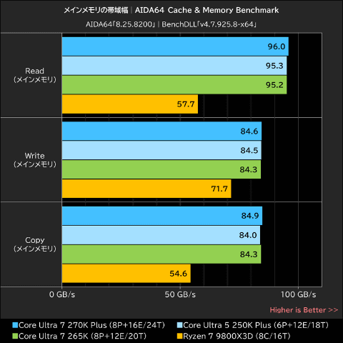 今回は、Core Ultra 200S PlusとCore Ultra 7 265Kが同じDDR5-6400メモリを搭載しているため、メモリ帯域幅自体はほぼ同等といっても良い程度の速度を記録。Core Ultra 7 270K Plusのメモリ帯域幅はリード96.0GB/s、ライト84.6GB/s、コピー84.9GB/sだった。