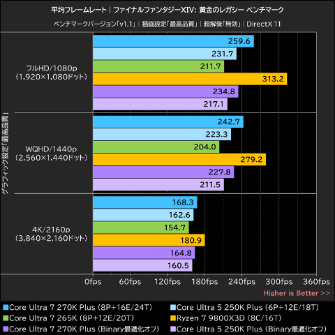 また、ファイナルファンタジーXIVはCore Ultra 200S Plusで導入されたBinary Optimization Tool(Binary最適化)の対象タイトルなので、Core Ultra 200S PlusではBinary最適化を無効にした場合のパフォーマンスも計測してみた。