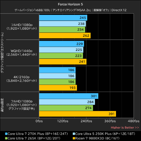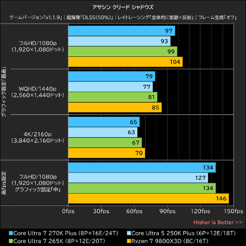 すべての条件で全体ベストを獲得したのはRyzen 7 9800X3Dで、Core Ultra 7 270K PlusはRyzen 7 9800X3Dを約7~8%下回っている。