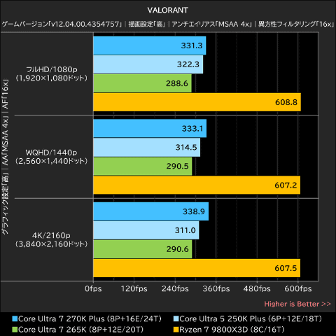 すべての条件で全体ベストを獲得したのはRyzen 7 9800X3Dで、Core Ultra 7 270K PlusはRyzen 7 9800X3Dを約16~25%下回った。